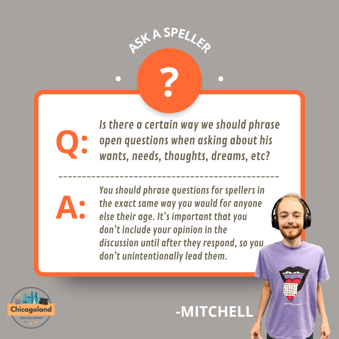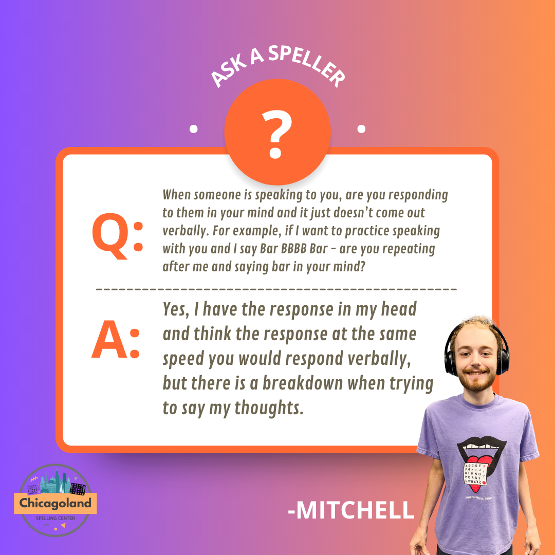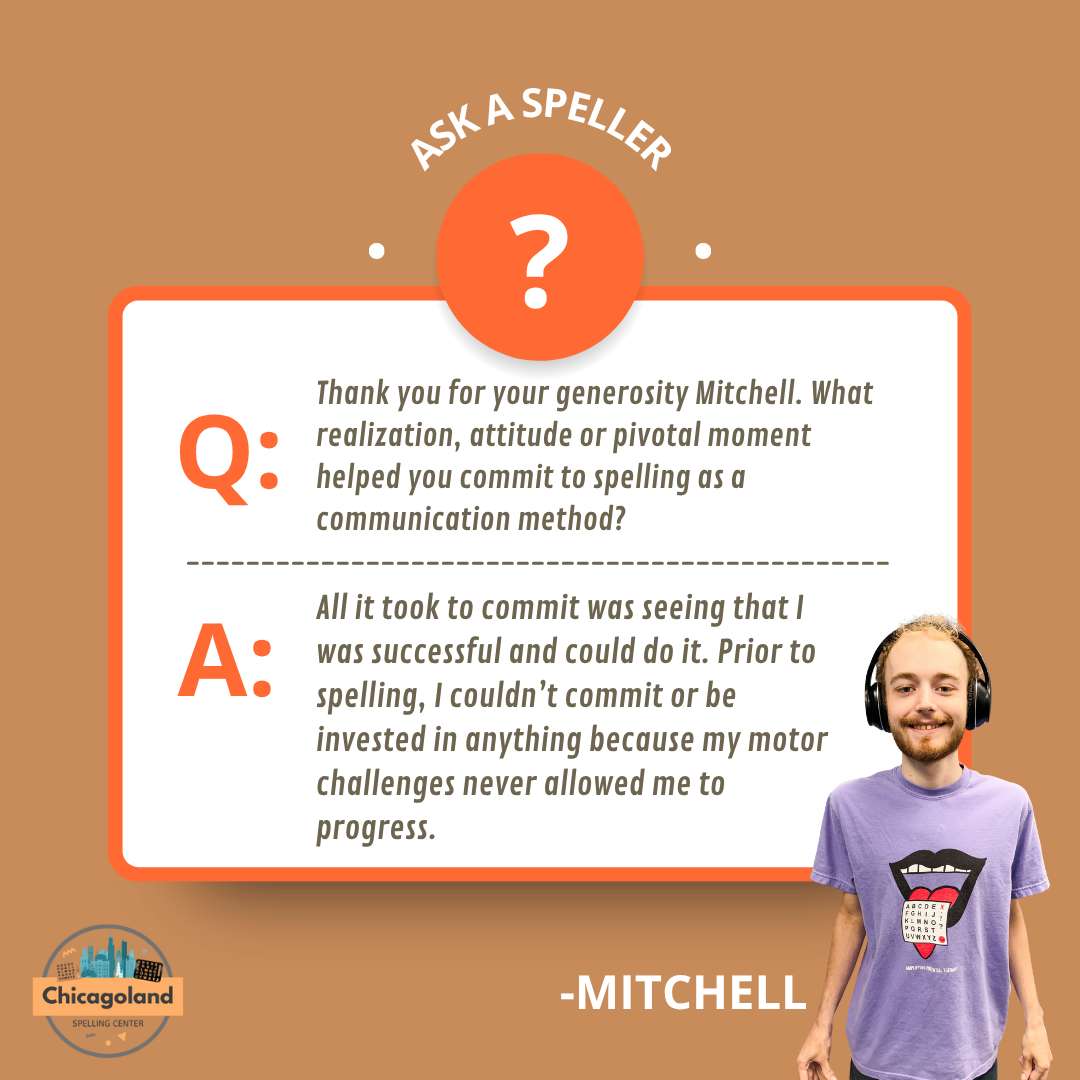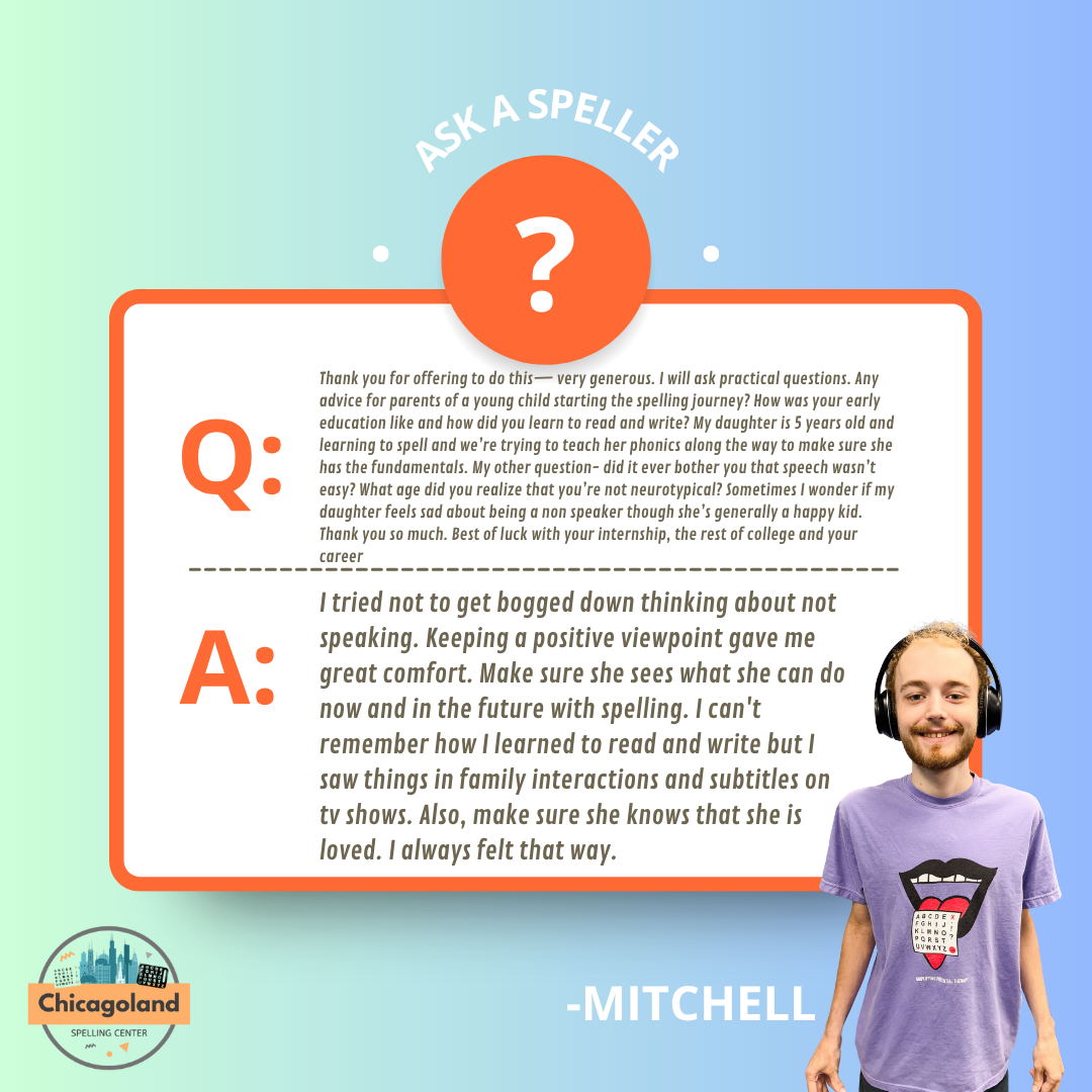 The Chicagoland Spelling Center was founded out of Mitchell Robins’s vision to create a supportive spelling community in the Chicagoland area. With over 10 years of spelling experience, Mitchell is a dedicated and passionate advocate for the nonspeaking community. Among his many advocacy efforts, he has taken on the important role of answering questions from the community. You can explore his thoughtful responses below.